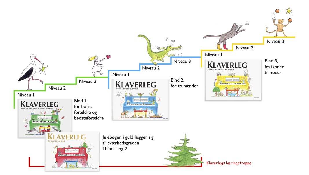 Klaverlegsserien er en tretrinsraket, hvor barnet i Bind 1/oplever sine første musikalske successer og inspireres til de næste skridt. Ikonerne er midlet til en sjov og nem opstart. Målet er, at barnet skridt for skridt udvikler sin musikalske formåen indenfor en pædagogisk fastlagt ramme.